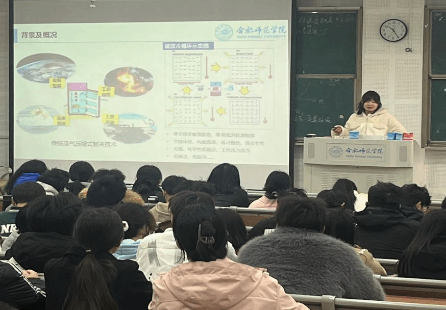 2025年3月10日上午,天天莫天天爽学生妹张雪倩、胡吉玉两位老师在滨湖校区博学楼A108教室做了两场“行知讲堂”学术报告,2023级新能源材料与器件专业全体学生聆听了报告。