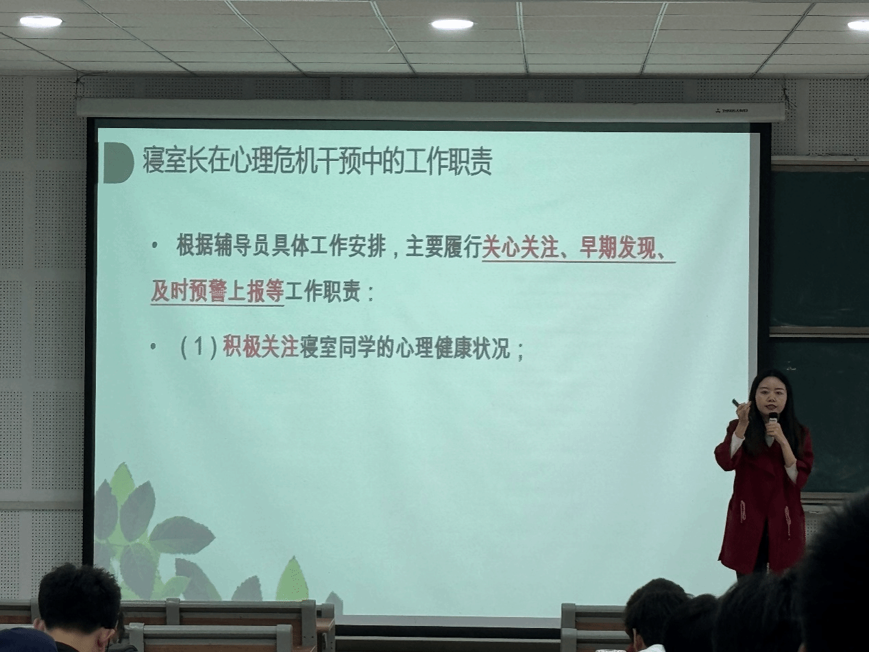 培训期间,张玲俐从“什么是心理危机”、“心理危机的识别”、“寝室长在心理危机干预中的地位”、“应对自杀风险的误区”四个方面向寝室长介绍了心理危机的定义及重要变化,容易产生心理问题的各种情况。她强调了寝室长作为非专业人员在学校四级心理健康网络中的重要作用,详细讲解了寝室长在大学生心理健康工作中的角色定位和工作职责。