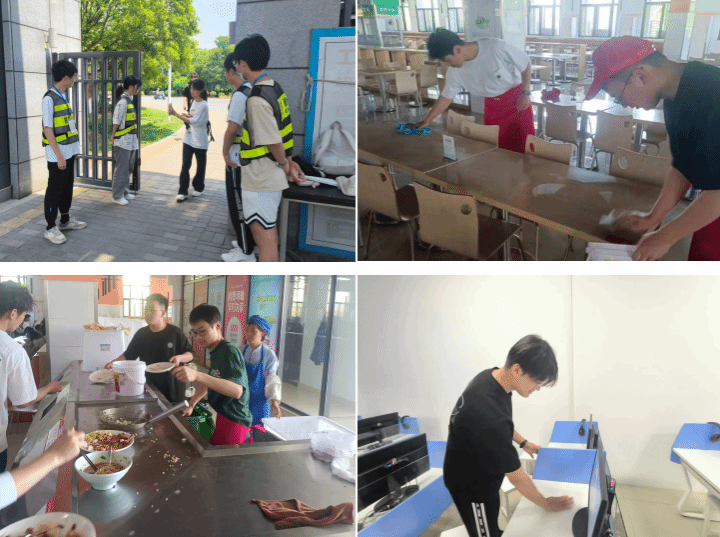 教学楼中,学生们携带工具,对教室地面以及桌兜里的垃圾、桌面上的字迹及地面、墙角、窗台等卫生死角,进行了细致全面的清洁,有序并完成了各区域的清扫工作。食堂中,同学热情帮助食堂工作人员擦桌子、打汤、倒剩饭剩菜。校园安保实践中,他们顶着烈日在校门值班、校内巡逻,参与校园管理和文明劝导工作。