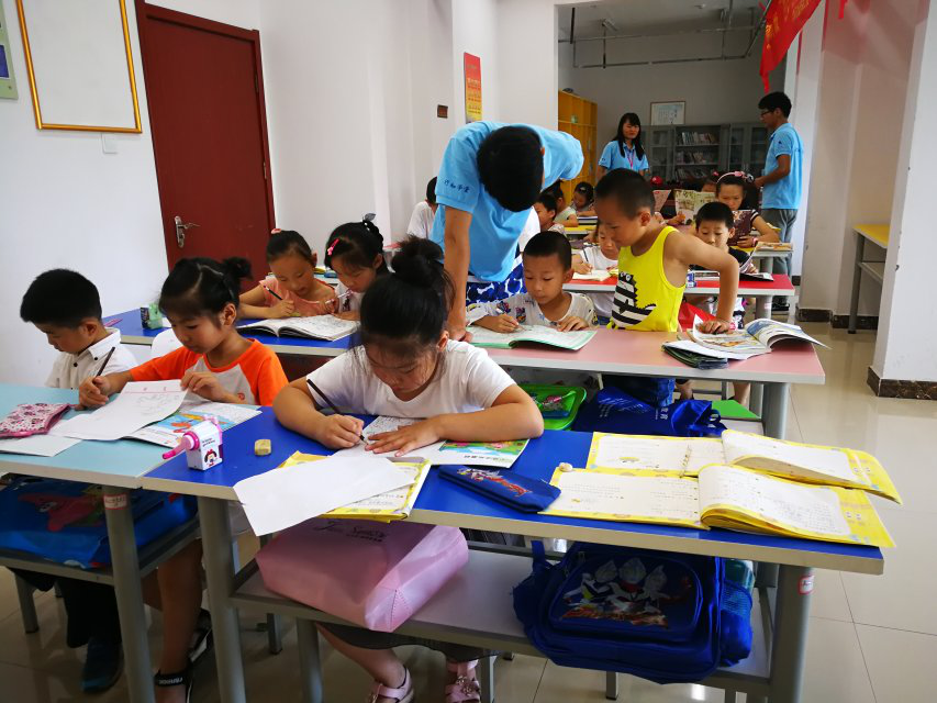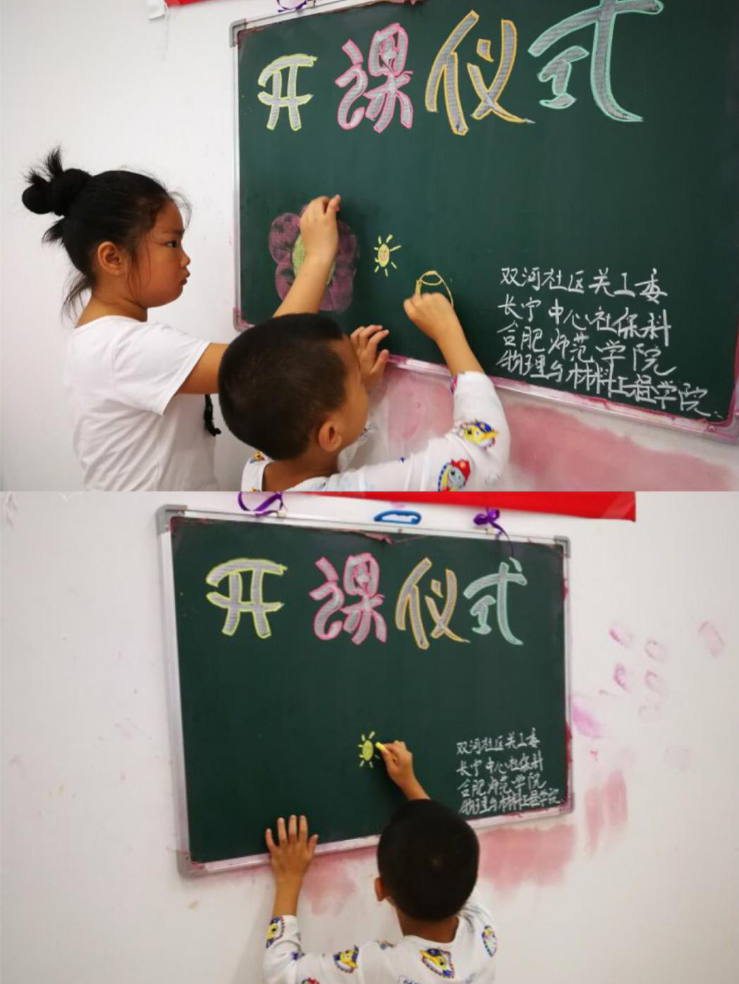 7月16日上午,“小先生”们早早地来到了双河社区农家书屋,为开班仪式做准备。上午八点半,小学员们都到齐了,在“小先生”指导下,小学员们积极踊跃地设计欢迎小黑板、装扮教室,迅速融为欢乐的集体,在一片欢声笑语中,找到了归属感与认同感。
