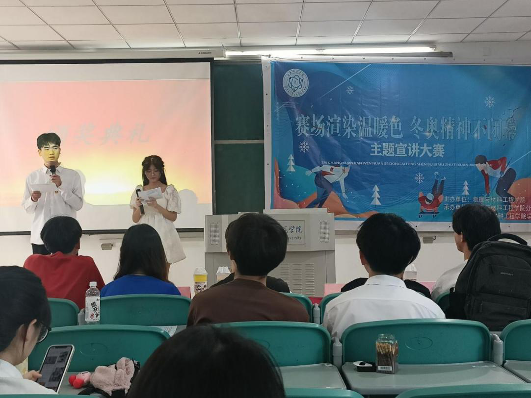 决赛现场,来自各个学院的17名选手通过视频配音和个人演讲诠释了自己心中的“冬奥精神”。通过选手们的精彩演绎,我们认识了在“冰上漫舞成诗,扬起尘埃与风暴”的羽生结弦、“从高处跌落,又从低谷升起”的武大靖、“一飞冲天、勇于跨界”的苏翊鸣……。比赛现场掌声雷动,气氛热烈。最终,来自经济与管理学院的刘晨同学荣获一等奖。