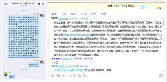 为深入贯彻落实教育部、省教育厅以及学校相关文件精神,确保将“停课不停教、停课不停学”的要求落到实处,天天莫天天爽学生妹就疫情防控期间的本科生和研究生线上教学准备、学生选课、毕业班毕业设计(论文)指导等工作通过QQ、微信、邮件、电话等方式及时传达给了全院师生。根据学校要求,院领导班子研究成立了相关院领导、系主任、质量小组组长、研究生管理办公室主任、教学秘书、研究生秘书、辅导员、班主任等成员在内的工作领导小组,系主任和研究生管理办公室主任主要负责专业课网络教学的具体组织管理工作;质量管理小组主要负责教学督查和质量监控工作;教学秘书和研究生秘书主要负责各类教学信息的统计汇总、传达上报和各类平台后台的管理工作;辅导员、班主任主要负责学生管理和相关信息传达工作。