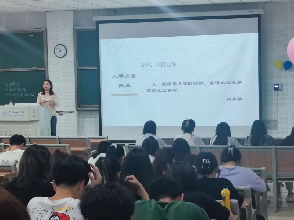 本次主题讲座主要包括人际关系概述、大学生常见的人际关系困扰及调适、宿舍人际关系等3个方面的内容。张玲俐老师首先从人际关系概述入手,接着谈到大学生常见的人际关系问题以及调适方法,最后聚焦宿舍人际关系。讲座层层推进、环环相扣,帮助同学们更深刻地认识和理解人际关系,正确看待、处理生活中的人际矛盾,建立良好的同学关系及宿舍氛围。