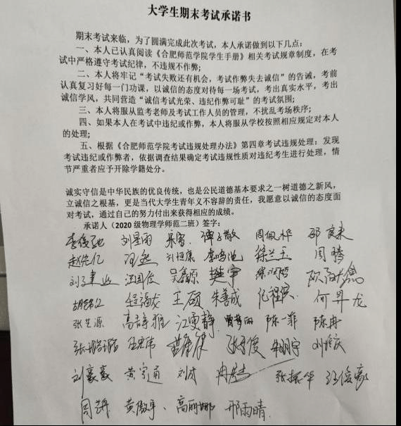 各年级辅导员和班主任强调了诚信考试的重要性和必要性,并带领同学们集体学习了《高等学校学生行为准则》和《合肥师范学院学生考试违规处理办法》等学校文件规定,了解有关考试违纪作弊行为的认定以及相关处理方法。要求大家树立正确的学习观和考试观,提高自身的诚信意识,勤奋刻苦,认真备考,以自身努力的汗水赢取优异的成绩,坚决抵制违纪作弊行为。