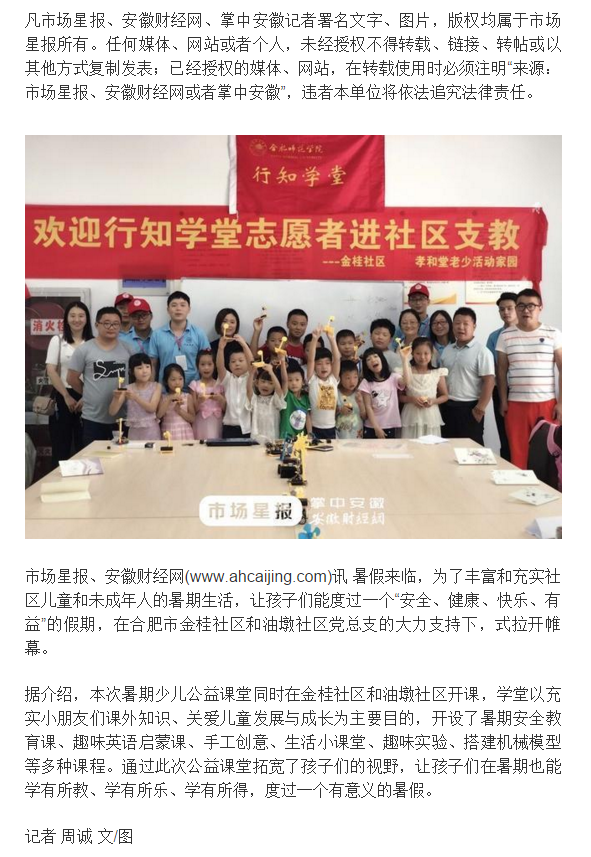 7月17日,市场星报、安徽财经网对我院天天莫天天爽学生妹金桂社区“励学行知学堂”进行了报道。(天天莫天天爽学生妹)