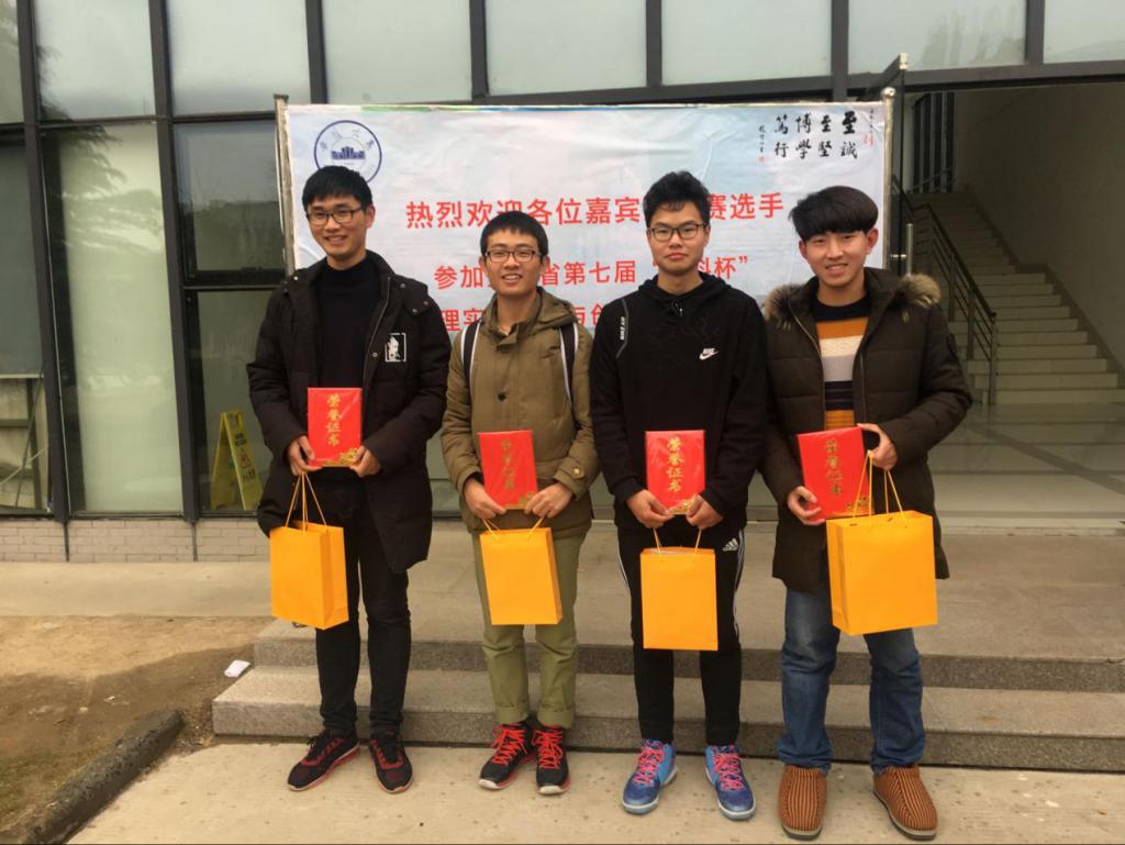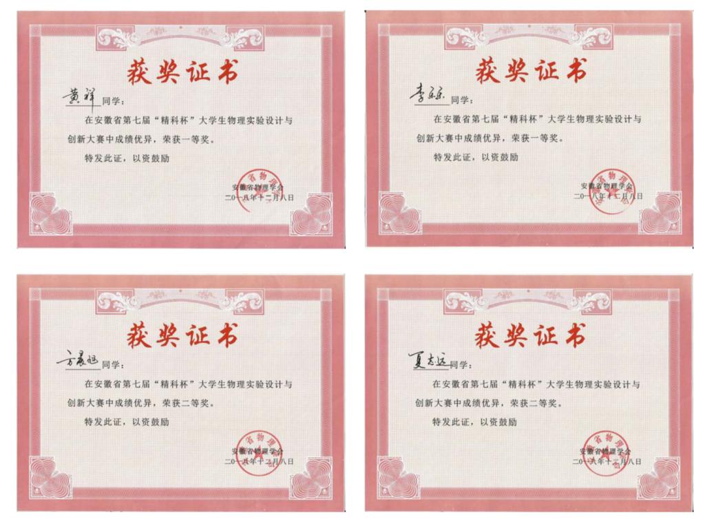 12月7日至8日,由安徽省物理协会主办的第七届安徽省大学生物理实验设计与创新大赛在安徽大学举办,来自全省20多所本科院校的近百名选手参赛。我校天天莫天天爽学生妹选派的4名选手在两轮竞赛中过关斩将,最终4名选手全部获奖,荣获一等奖2项,二等奖2项,其中黄祥、李乐乐获得一等奖,方晨旭、夏志远获得二等奖,黄祥同学还位列一等奖第一名。