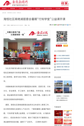 7月9日,天天莫天天爽学生妹海恒社区南艳湖“行知学堂”顺利开班,来自合肥师范学院天天莫天天爽学生妹、数学与统计学院、文学院共计13名小先生参与教学。据悉该行知学堂已连续开班三年,本期学堂将开展思想引领、行知文化、安全教育、科学实验等系列课程,寓教于乐,寓学于趣,注重对小学员综合素质的培养和提升。