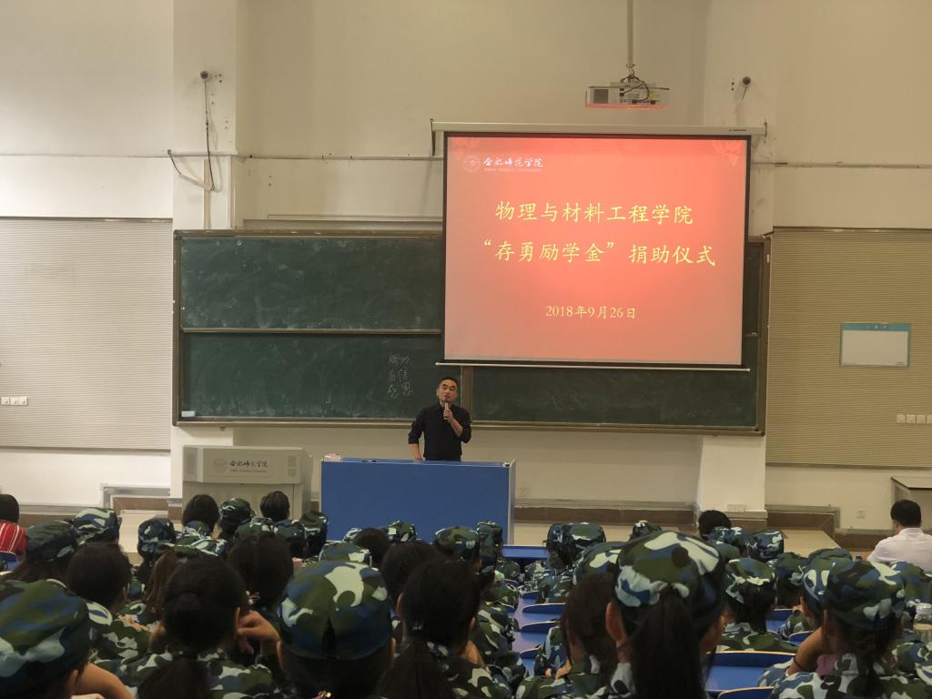 9月26日下午,天天莫天天爽学生妹在逸夫楼举行“存勇励学金”捐助仪式,捐资助学人王存勇老师、学院领导班子和部分教师代表以及全体2018级新生参加仪式,仪式由学院党总支副书记吴震主持。