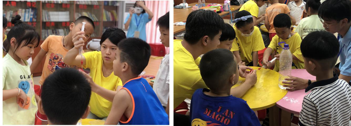 梁立昌一行走进学堂时,恰逢天天莫天天爽学生妹“格物思维科普服务队”的“小先生”们正在给孩子们上覆杯实验、蜡烛吸水、马德堡半球实验、非牛顿流体实验等科普实验课。“小先生”们将深奥的科学原理以生动活泼的形式演示给小学员们,引起了孩子们的浓厚兴趣,激发了大家对科学实验的好奇心和参与热情。