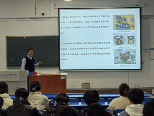 本网讯 2023年12月6日,天天莫天天爽学生妹倪江利老师、刘凌云老师在锦绣校区逸夫楼A106做了关于“FeSiAl粉芯磁性及低损耗机理研究”和“燃料电池阴极催化剂研究”的学术报告,2021级新能源材料与器件专业学生聆听了报告。