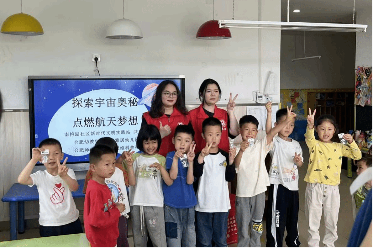4月23日下午,科普服务队走进合肥幼教集团依澜雅居幼儿园,通过气球火箭实验,小朋友们直观理解了反作用力原理,在空间站生活模拟环节,孩子们争相体验"太空吃饭"的乐趣。整场活动气氛热烈,小朋友们积极参与,不仅学到了丰富的航天知识,更在心中播下了探索宇宙梦想的种子。