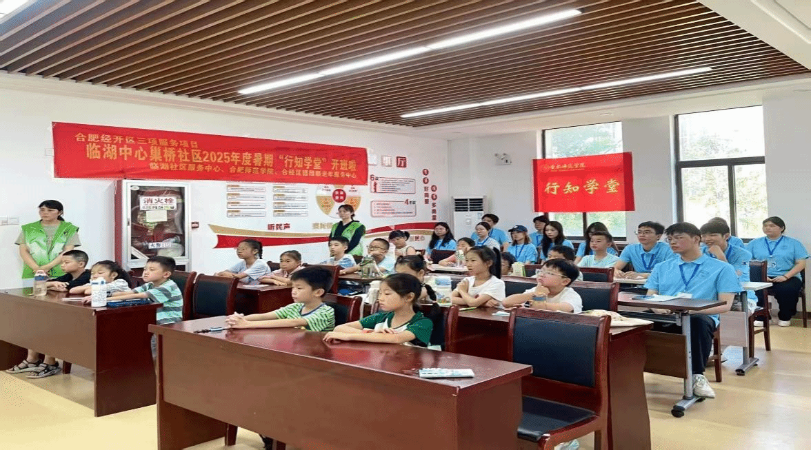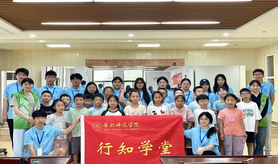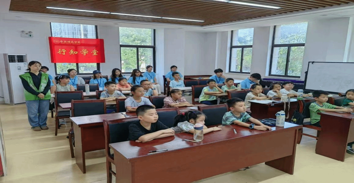 “小先生”代表屈佳男向小学员和家长们介绍合肥师范学院“行知学堂”志愿服务的办学历程和育人成果。同时介绍本次“筑梦巢桥”行知学堂的课程周期、课程安排和特色活动,涵盖安全教育、思想启蒙、行知文化、趣味科普、心灵启发和传统文化等丰富内容。