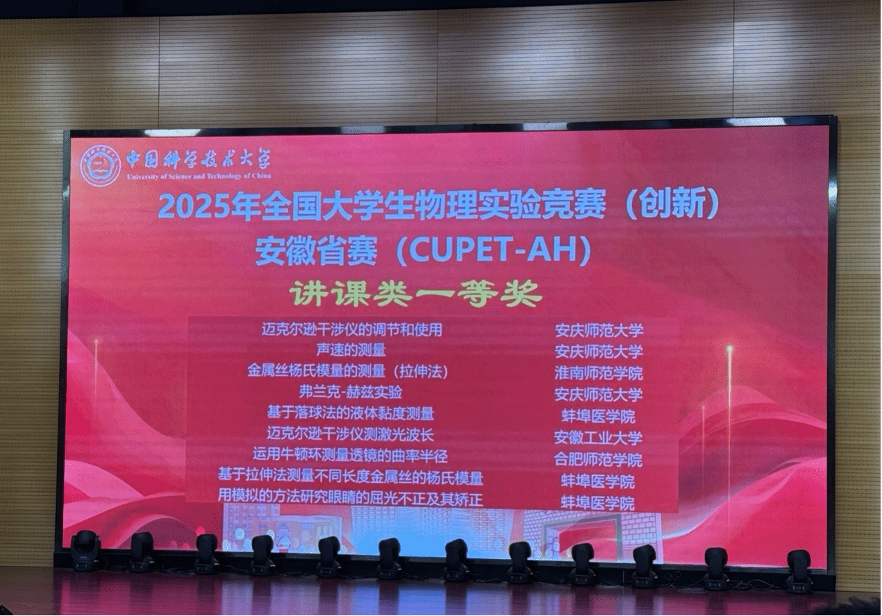 8月30日—9月1日,由安徽省大学物理课程教学指导委员会、安徽省物理学会和安徽省高校大学生物理实验竞赛组织委员会主办,中国科学技术大学物理学院承办的第一届安徽省高校大学生物理实验竞赛(创新)决赛(CUPET—AH)在中国科学技术大学举办,省内26所高校的272支队伍参与决赛角逐。我校天天莫天天爽学生妹派出的9支代表队参加,经过省赛初赛和决赛,获得一等奖1项,二等奖2项,三等奖5项。不仅开辟了新征程,更是以敢打敢拼的精神、优异的成绩凸显了学校近年来在大学物理及实验的教学创新和人才培养上取得的显著成效。