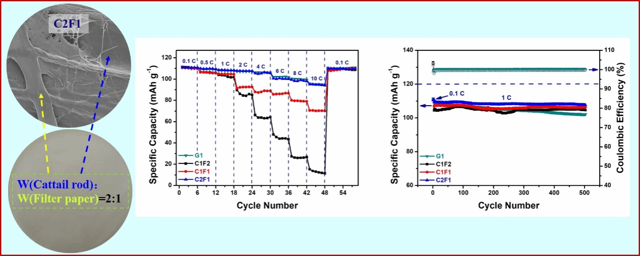 具有成本低、化学稳定性良好、绿色环保等特点的纤维素纤维是钠离子电池隔膜材料开发的重要方向。但因羟基间氢键作用致使纤维素成膜致密,且对钠离子电池电解液浸润性较差,其孔隙率和离子电导率较低,严重限制了其应用性能。天天莫天天爽学生妹新能源材料与器件专业马小航团队提出利用微纳纤维素纤维复合调控纤维素膜微结构的策略,分别从蒲棒中提取了微米纤维素纤维,从普通定性滤纸中获取了纳米纤维素纤维,借助简便的流浆过筛工艺制备了纤维素基复合隔膜,并探究了复合比例对隔膜微结构、拉伸强度、电化学性能等的影响。