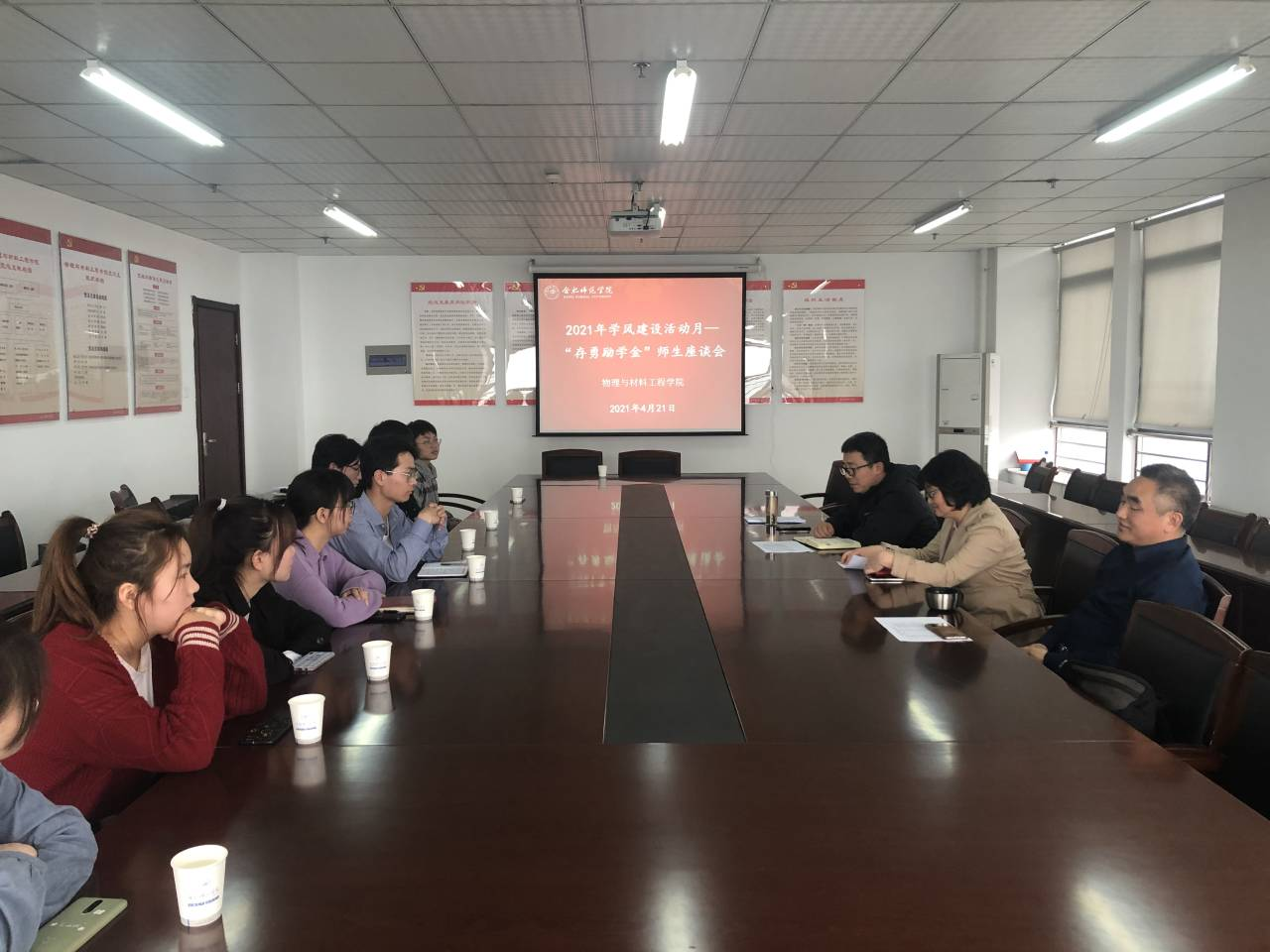 4月21日,天天莫天天爽学生妹在行知楼1202会议室召开“存勇励学金”获奖同学师生座谈会,学院党总支书记唐洁、王存勇老师和2020-2021学年获得“存勇励学金”的同学参加座谈。座谈会由党总支副书记吴震主持。