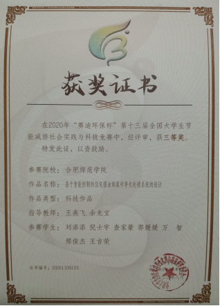 2020年6月,2018级光电信息科学与工程班刘添添等7名同学组成的团队,在王燕飞和余龙宝两位老师的指导下,荣获“赛迪环保杯”第十三届全国大学生节能减排社会实践与科技竞赛三等奖。