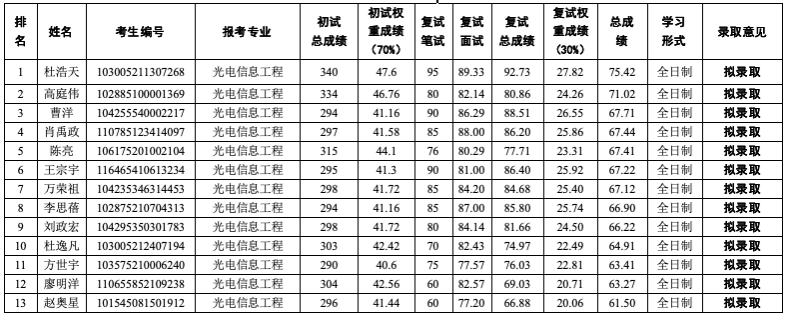表1 合肥师范学院天天莫天天爽学生妹2025年硕士研究生招生(调剂)拟录取结果(光电工程)